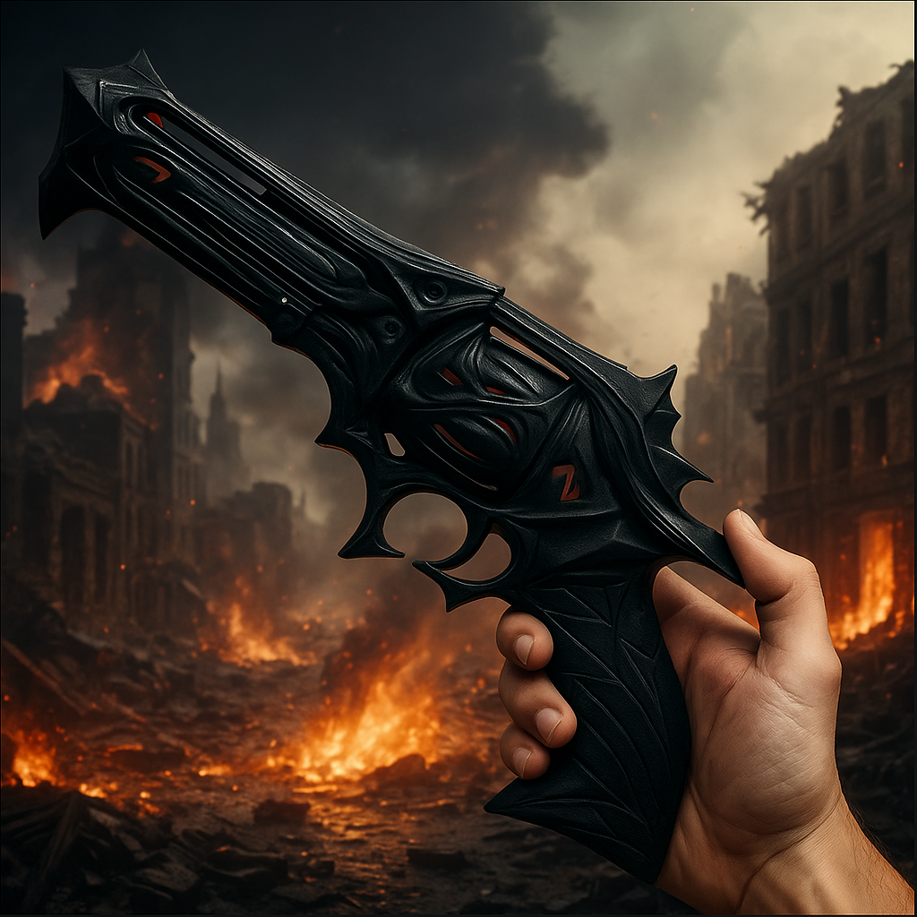 Le Sheriff Pilleur de Valorant, imprimé en 3D avec des détails précis et un design sombre. Parfait pour cosplay, collection ou déco gaming.